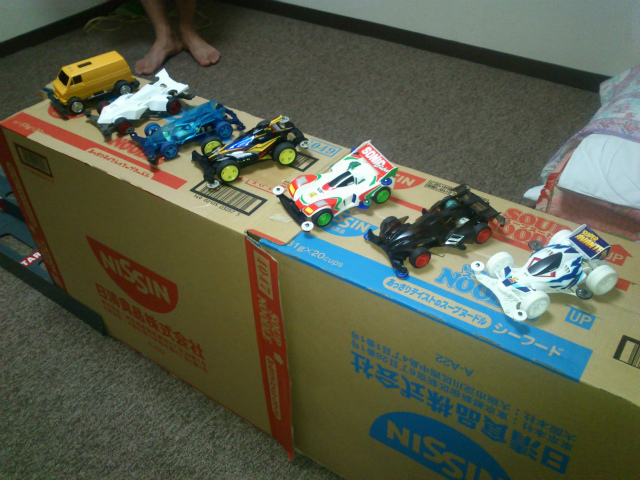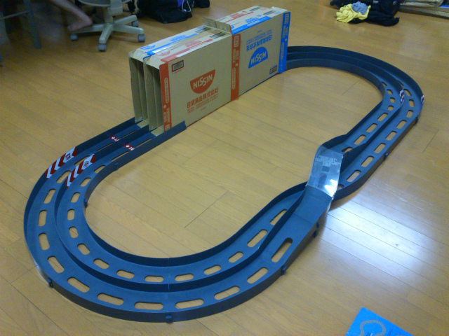 タミヤ・オーバルホームサーキット・J-CUP公認コースにお手製ストレート段ボールトンネルを加えたモノ。